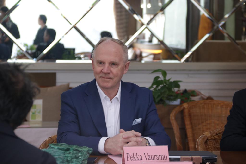 和机电工程学院的学生代表举行了面对面座谈。Pekka Vauramo先生针对环保、学生未来发展和专业学习等方面问题提出了自己的看法。Pekka Vauramo认为,美卓公司高度重视环保,在环保的前提下满足客户的需求,尽可能保证产品生产效率,并且环保于可持续发展也符合中国对于企业发展的要求。他也提到在学生的未来职业发展中,应当尽力找到自己感兴趣的方向,不受他人看法的影响,脚踏实地做,并持续为之努力。希望同学们都能够有自己的理想,一步一个脚印地去做好。