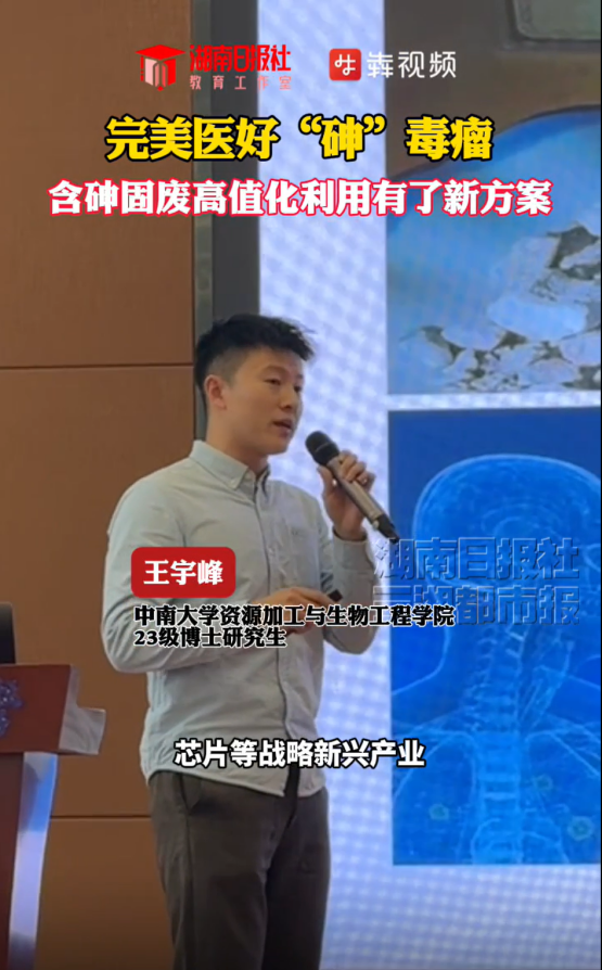 矿物加工专业2023级博士生王宇峰因在创新创业、科技攻关等方面表现突出,获得央视新闻报道。“95”后的王宇峰与砷治理结缘于有“世界锑都”之称的湖南冷水江锡矿山。他与导师、师兄投身工厂一线,开展实验研究。虽然条件非常艰苦,脸上时长因防毒面罩的长期闷热而浸出红疹。鼻梁、脸颊都留下深深的烙印,衣服每天都会浸湿几回。但他也深刻体会到底层工人的不易与辛勤劳动的可贵品质。认识到,锡矿山的砷害问题若得不到有效解决,资江流域的水质将面临前所未有的巨大威胁。这不仅是一项科研任务,更是关系民生的头等大事。