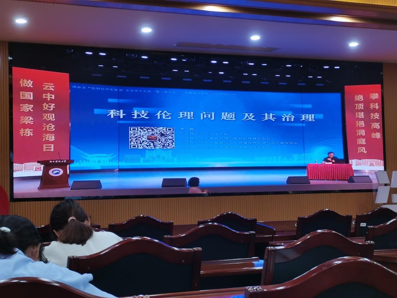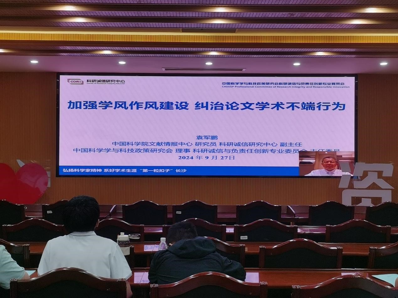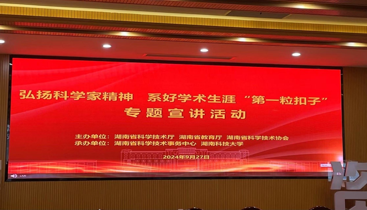2024年9月27日14:30,“弘扬科学家精神、系好学术生涯‘第一粒扣子’”专题宣讲活动在湖南科技大学召开,活动由湖南省科学技术厅、湖南省教育厅、湖南省科学技术协会联合主办,湖南省科学技术事务中心、湖南科技大学承办,本次活动共设立24个会场,采用“线上+线下”相结合的形式,引导广大科研人员自觉弘扬科学家精神,重视科研诚信与学术规范,加强科研作风和学风建设,走好学术生涯第一步。